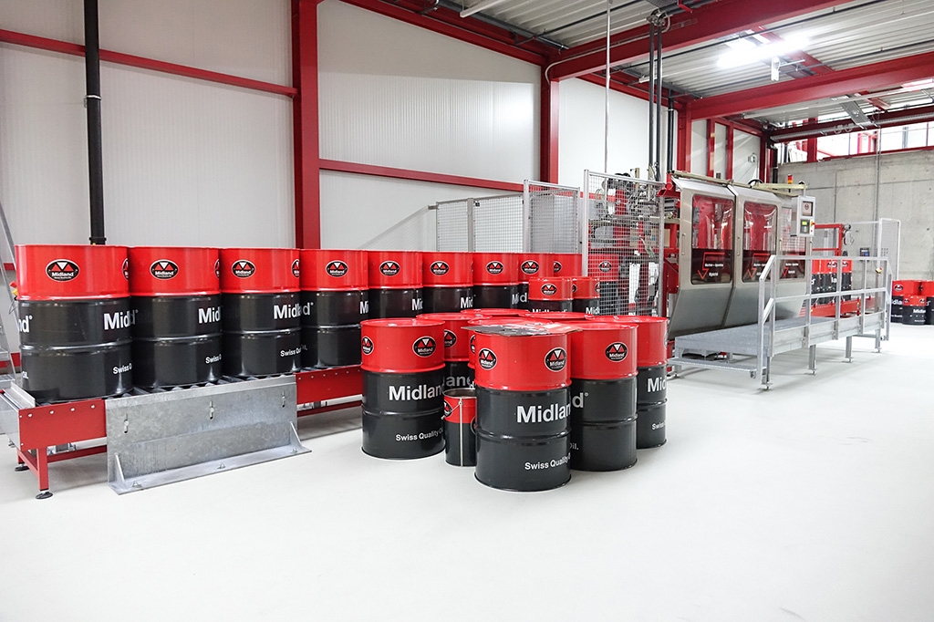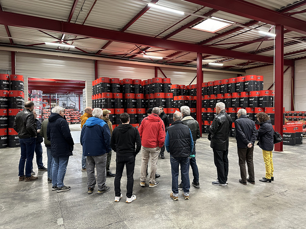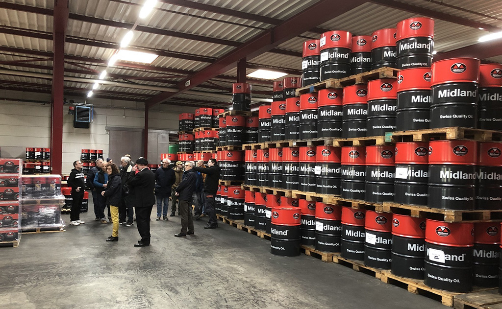 Lukas Noth, Verkaufsleiter, begrüsste die Gästeschar herzlich und stellte Fredi Brack vor, Teilhaber der Oel-Brack AG, sowie dessen Neffen Daniel Brack, Betriebsleiter. Dani und sein Onkel Fredi führten uns zu einem einstündigen Rundgang durch den Betrieb. Dabei erklärten sie ausführlich den Produktionsablauf und die ganze Entwicklung von den Anfängen bis in die Neuzeit. Zunächst ging es in die ehemalige stillgelegte Produktionshalle, wo noch einige Tanks und Mischanlagen stehen. Danach kamen wir ins Staunen, als uns Dani in die grosse Lagerhalle führte, wo sich gigantisch viele Fässer, auf Paletten gestapelt, türmten. Die einen sind für die Lieferung bereitgestellt, die anderen als Reserve gehalten, um jederzeit lieferbereit zu sein. Midland Oil liefert nach eigenen Angaben in 20 verschiedene Länder, vorwiegend nach Skandinavien, Zentral- und Osteuropa. Am Ende kamen wir im Zentrum der Produktionsanlage an. Von Grundöl- und Additivtanks führen Leitungen zur Mischanlage über das Herzstück, ein Terminal. Dieses steuert die Ventile, Pumpen, Heizung, sowie die Rührwerke und stellt damit die exakte Mischung nach Rezepten sicher. In mehreren eigens hergestellten Abfüllanlagen werden die verschieden grossen Gebinde gefüllt. Die laufende Produktion konnten wir zwar nicht miterleben, weil die Lärmentwicklung zu heftig gewesen wäre, aber wir konnten einen vertieften Einblick in die Produktion gewinnen.