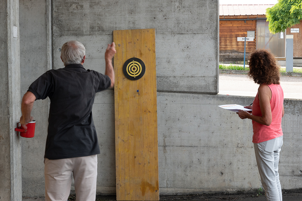 Gestartet wurde auf dem Coop Parkplatz in Bottmingen. Hier mussten wir unter anderem mit unseren Fahrzeugen möglichst nahe an einen Pfahl heranfahren, ohne dass ein auf dem Pfahl liegender Tennisball runterfiel. Weiter gings über Oberwil ins Industriegebiet Biel-Benken, wo erneut ein paar Posten zu bewältigen waren: Punktgenaues Anhalten, wobei einmal ein Punkt auf der vom Fahrer abgwandten Seite mit dem Hinterrad, einmal mit dem Vorderrad getroffen werden musste. Gar nicht so einfach, wie sich herausstellte. Pfeilschiessen und Würfeln waren ebenfalls Disziplinen. Bevor es zum Aperitif ins Fat Inn Restaurant in Dornach ging, durften wir nochmals unsere fahrerischen Fähigkeiten beweisen: Es galt einen möglichst engen Kreis zu fahren, während wir einem Holzkameraden die (an einem Stock befestigte) Hand halten mussten.